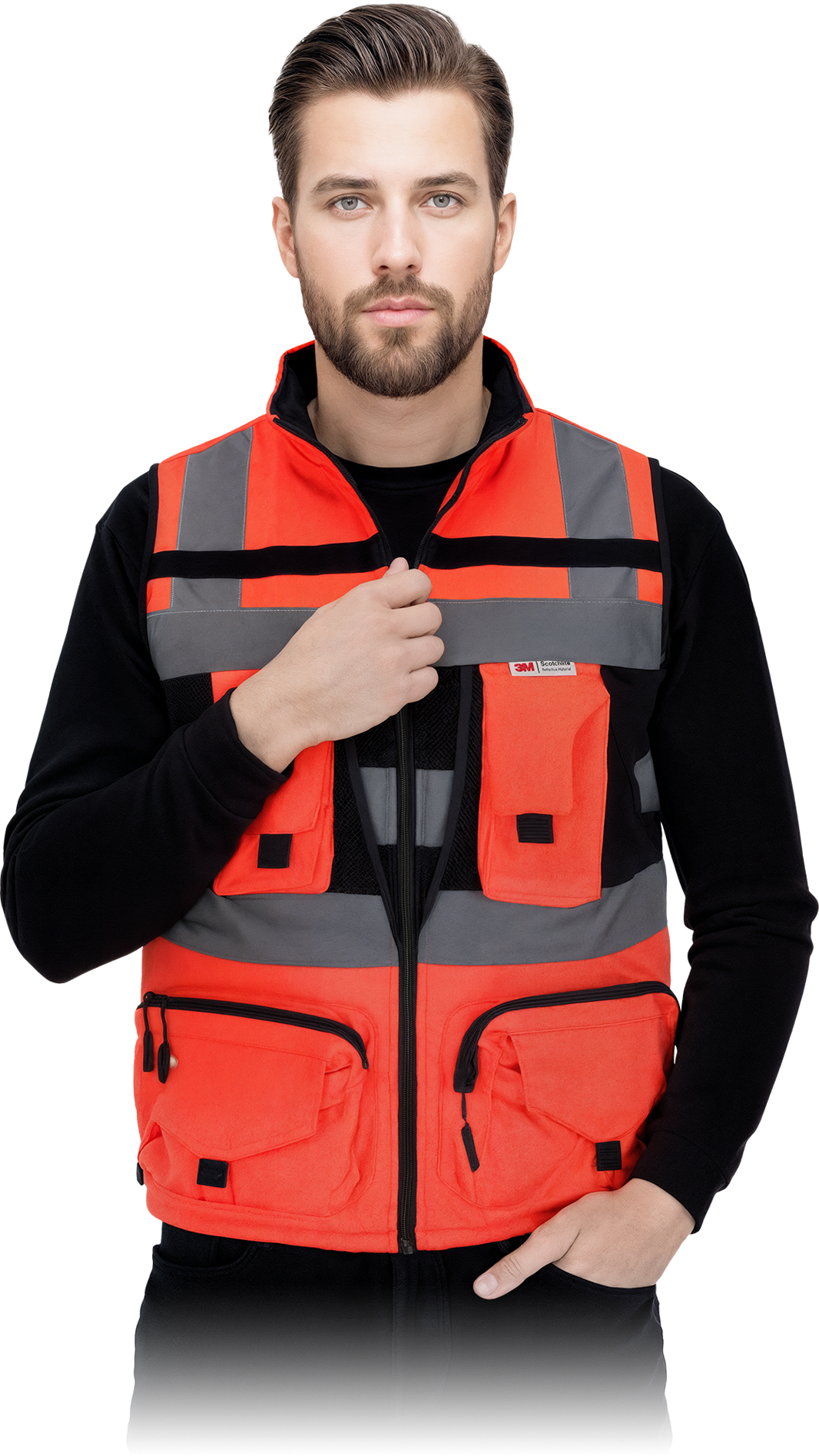 Kamizelka przeznaczona do pracy w terenie, szczególnie dla drogowców, służb porządkowych oraz pracowników wymagających wysokiej widoczności i dużej ilości kieszeni.