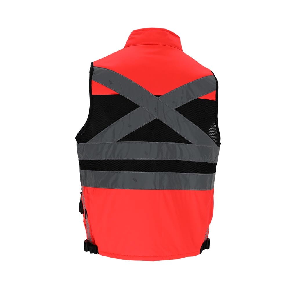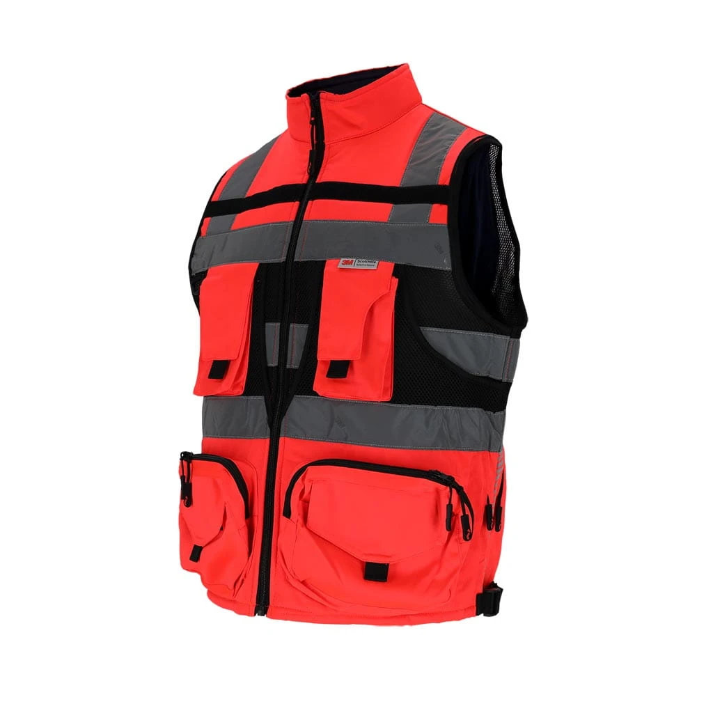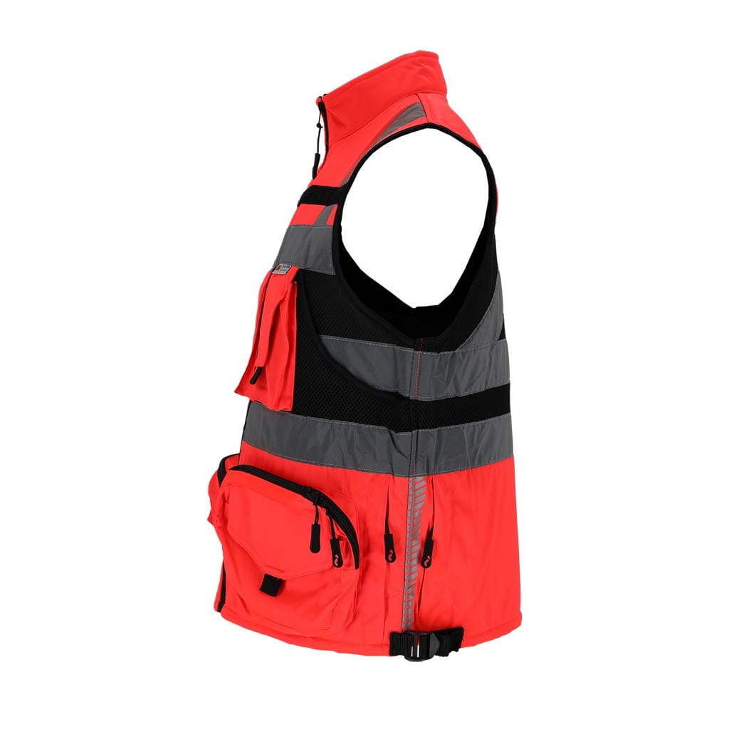 Wytrzymała kamizelka ostrzegawcza z grubszego materiału, wyposażona w liczne kieszenie, elementy odblaskowe 3M Scotchlite oraz regulację w pasie. Idealna do pracy w terenie i dla służb porządkowych.