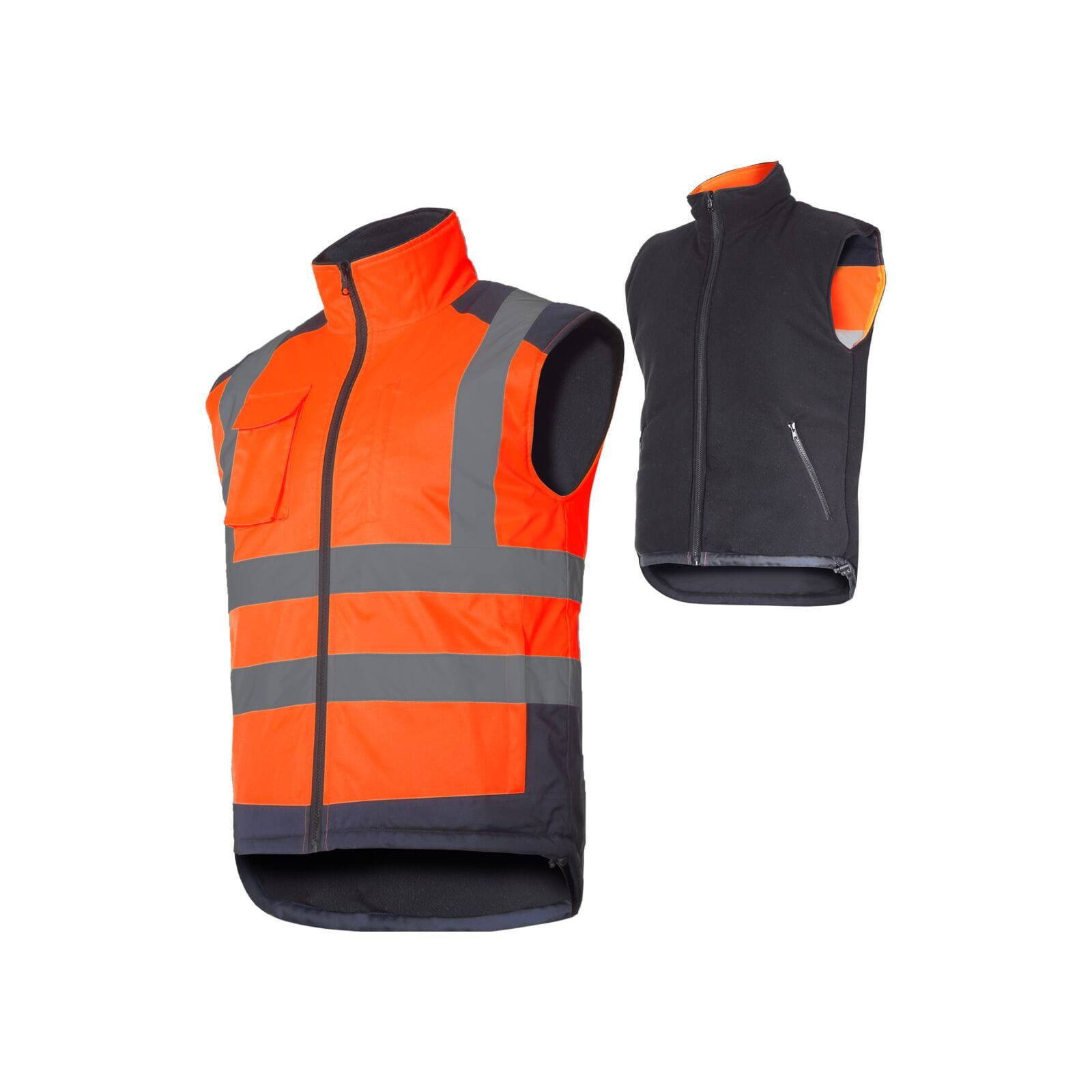 Ocieplina z poliestru o gramaturze 160 g/m² w połączeniu z polarową podszewką 220 g/m² zapewnia komfort cieplny nawet w chłodniejsze dni. Dwustronna konstrukcja pozwala na dopasowanie kamizelki do aktualnych warunków pracy. Pasy odblaskowe zgodne z normą EN ISO 20471 znacząco poprawiają widoczność użytkownika.